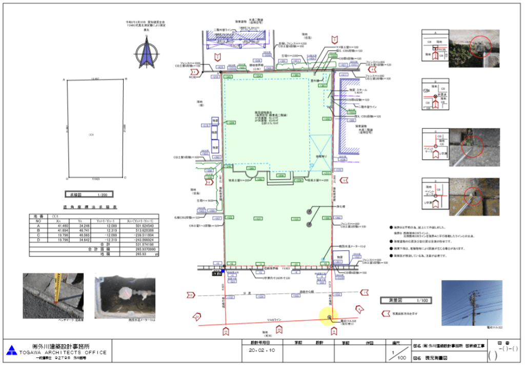 建築CADを使い、図面に杭などの写真を載せ、カラー化することでお客様、設計者、施工者、誰にとってもわかりやすい現況測量図を心がけています。